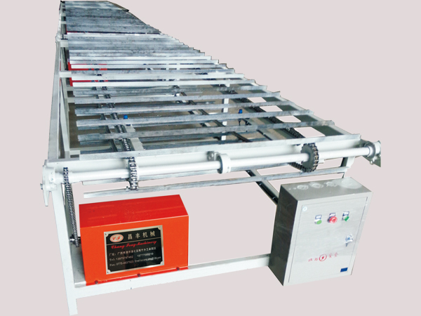 排板输送线是将板芯经涂胶机涂胶后自动输送到每个排板台前。大大提高生产 效率,代替传统人工送板工艺。降低劳动成本。解决了输送难,用人难,易烂板 等问题。